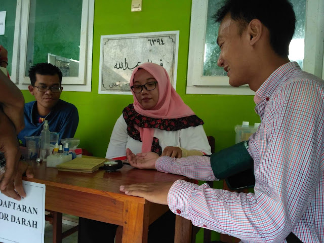 Mahasiswa dalam kegiatan Donor Darah. Tampak Petugas PMI Memeriksa Tekanan darah |