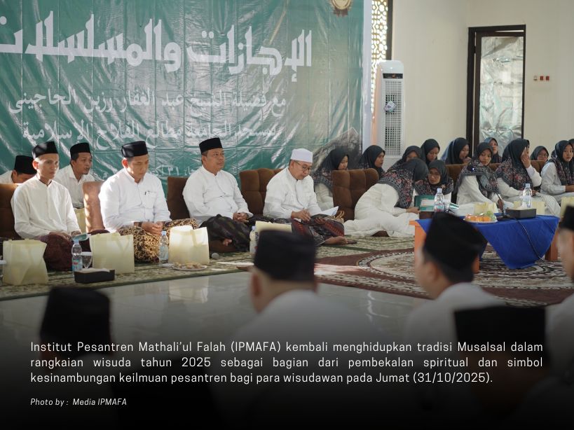 Redaksi IPMAFA — Institut Pesantren Mathali’ul Falah (IPMAFA) kembali menghidupkan tradisi Musalsal dalam rangkaian wisuda tahun 2025 sebagai bagian dari pembekalan spiritual dan simbol kesinambungan keilmuan pesantren bagi para wisudawan pada Jumat (31/10/2025).