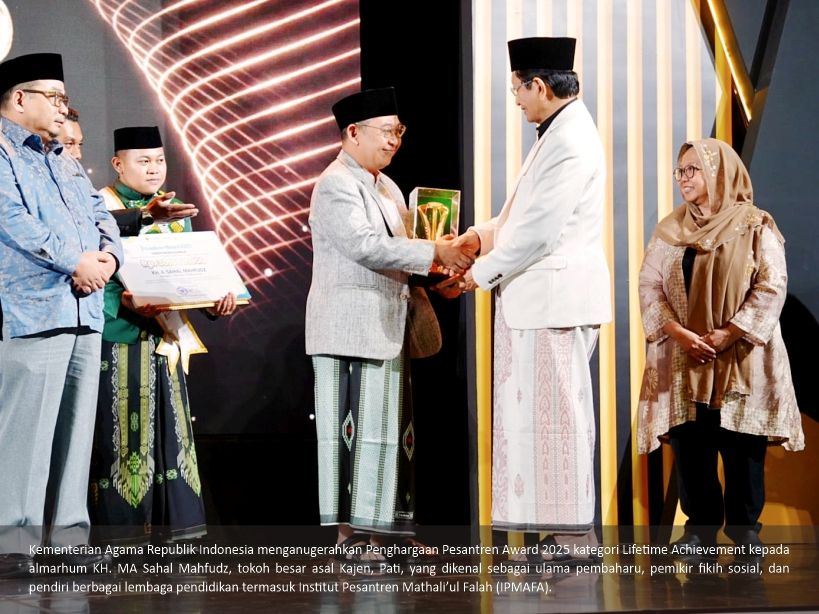 Redaksi IPMAFA — Kementerian Agama Republik Indonesia menganugerahkan Penghargaan Pesantren Award 2025 kategori Lifetime Achievement kepada almarhum KH. MA Sahal Mahfudh, tokoh besar asal Kajen, Pati, yang dikenal sebagai ulama pembaharu, pemikir fikih sosial, dan pendiri berbagai lembaga pendidikan termasuk Institut Pesantren Mathali’ul Falah (IPMAFA).