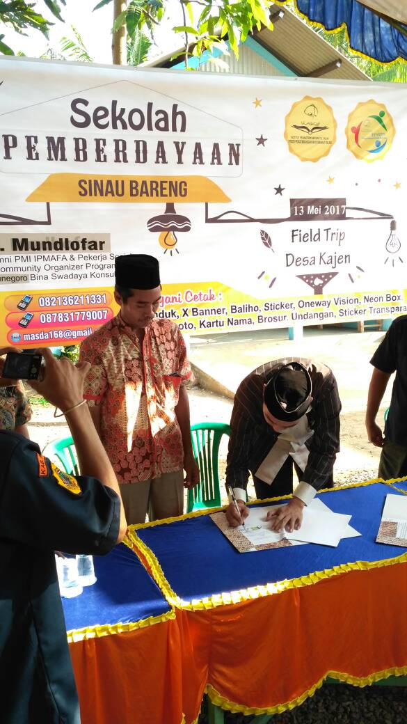Penandatanganan ini dihadiri oleh Kaprodi PMI Faiz Aminuddin MA, Ketua BUMDes Kajen Hasyim, Ketua Resik Apik Kajen Syahid Nurbaya, inspirator penggerak dan motivator desa Kajen Syafi’i, Manager Tempat Pengelolaan Sampah Reduce Reuse Recycle (TPS 3 R) Zamroni, serta puluhan mahasiswa PMI IPMAFA lintas generasi.